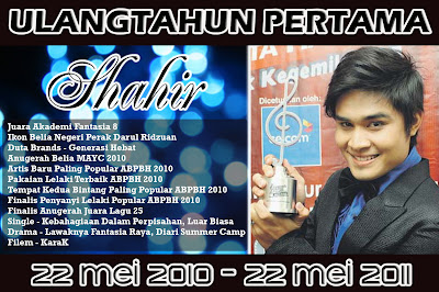 Kini 22 Mei 2011 tiba menandakan sudah setahun perjalanan seni Shahir. Semoga Shahir sentiasa tabah menempuhi cabaran-cabaran yang mendatang serta terus cemerlang mencipta kejayaan kerana Shahir sememangnya berbakat besar dan mampu maju lebih jauh lagi. Diharapkan juga album perdana Shahir dapat diedarkan secepat mungkin memandangkan para peminat Shahir sememangnya menantikan album tersebut. Kemunculan Shahir di dalam filem KaraK, filem pertama lakonan Shahir diharapkan dapat menjadi pemangkin atau pendorong kepada Shahir untuk terus memperkembangkan bakat lakonan. Selain itu, diharapkan agar Shahir terus bersinar bak sahmura dan sentiasa menghargai para peminat yang sentiasa memberikan sokongan padu buat Shahir. Tingkatkan prestasi dan kurangkan kontroversi. Insyaallah Shahir akan terus berjaya dan mampu berdiri setanding dengan artis-artis hebat di dalam industri seni ini. Akhir kata, selamat menyambut ulangtahun pertama di dalam industri seni buat Shahir. Sokongan buatmu akan sentiasa berterusan. Insyaallah.